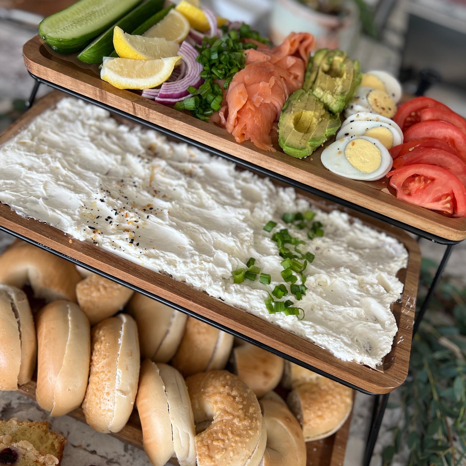 This beautifully styled spread features an assortment of freshly baked bagels, paired with premium smoked salmon, whipped cream cheese and all the traditional toppings like crisp cucumbers, juicy tomatoes, red onions, and briny capers. Garnished with lemon wedges, fresh herbs, and hard-boiled eggs, the board is rounded out with seasonal fruit, light pastries, and brunch-friendly bites that bring both color and flavor to the table. It’s a deliciously luxe way to start the day.
