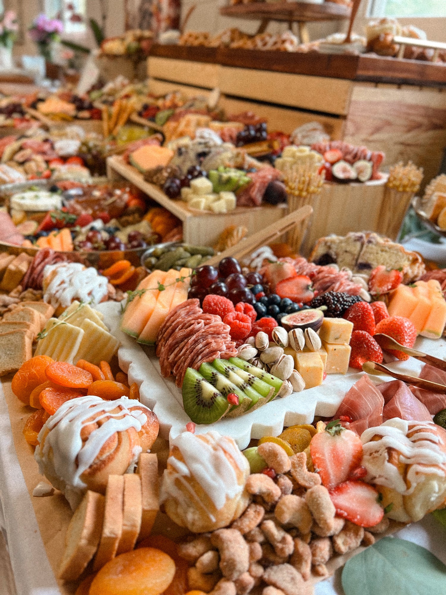 A refined take on brunch, this graze features delicate waffles, glazed donut holes, and a curated selection of fresh-baked pastries. Paired with artisanal cheeses, fine cured meats, and seasonal fruit, it’s finished with elegant accompaniments like honey, jams, and nuts. Perfectly styled for special mornings and memorable gatherings.
