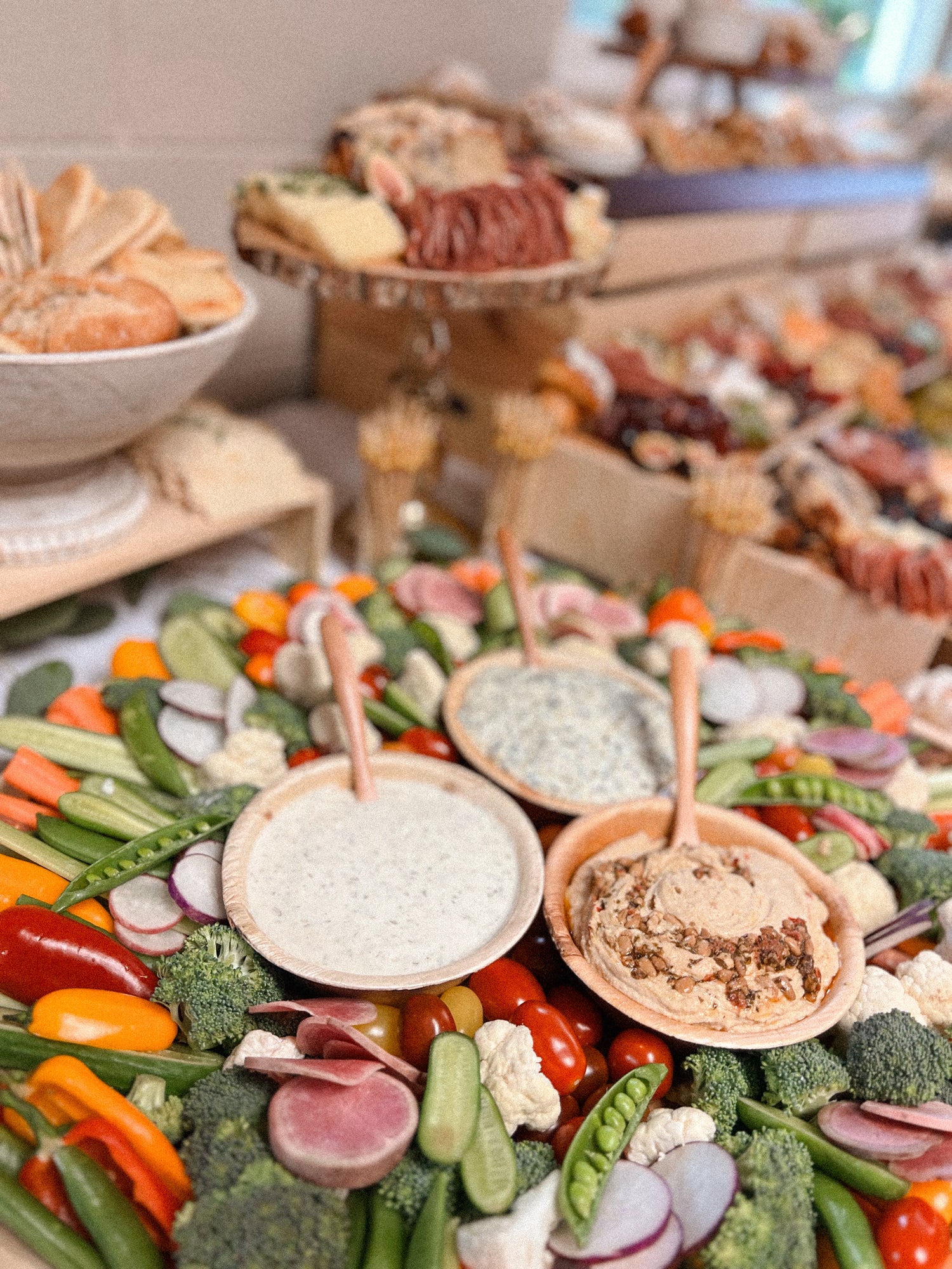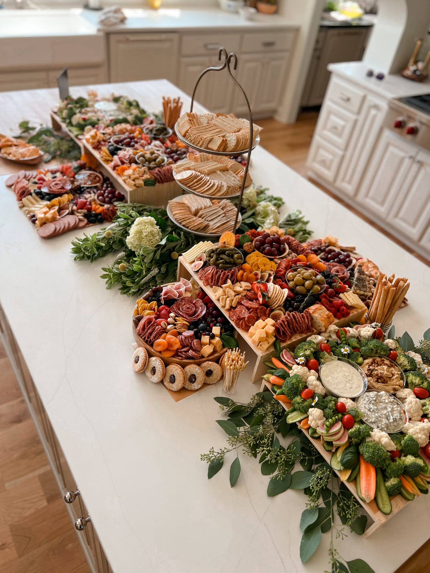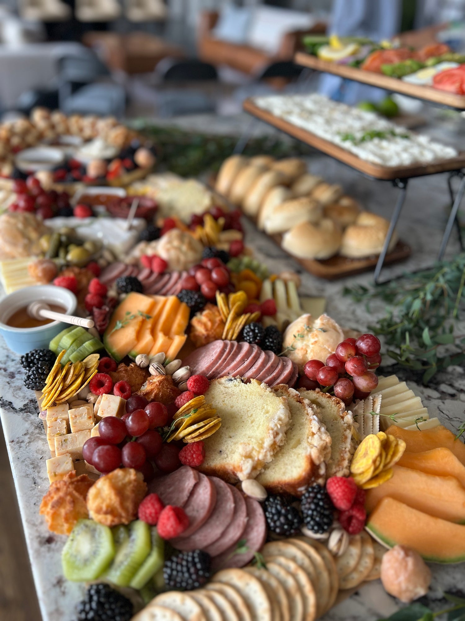 An elegant display of artisanal meats, cheeses, fruits, and gourmet bites. Designed for visual impact and effortless grazing, this tablescape-style spread lies flush with the table and is styled with greenery and layered textures. Luxurious yet inviting, it’s perfect for weddings, corporate events, showers, and celebrations.